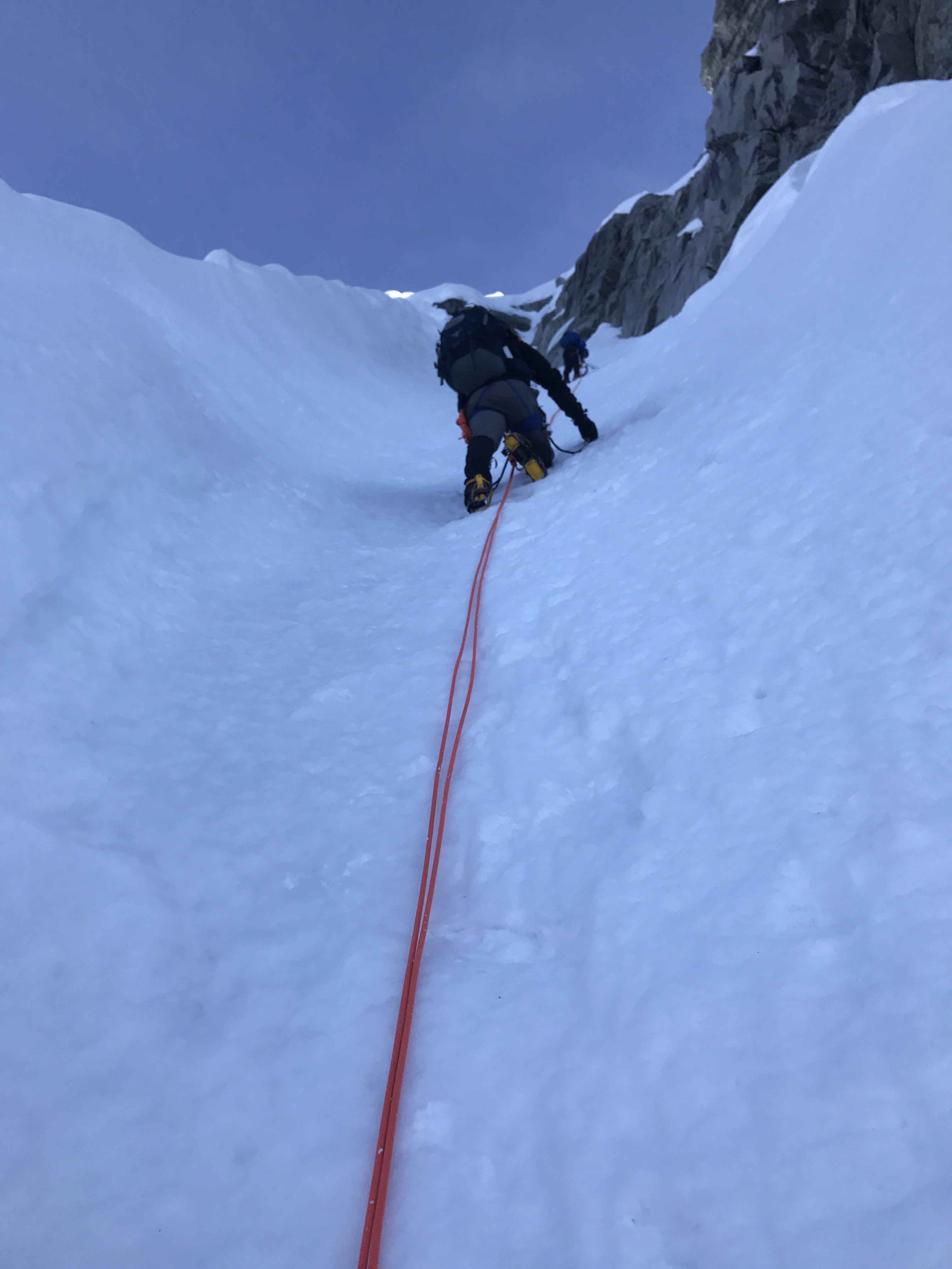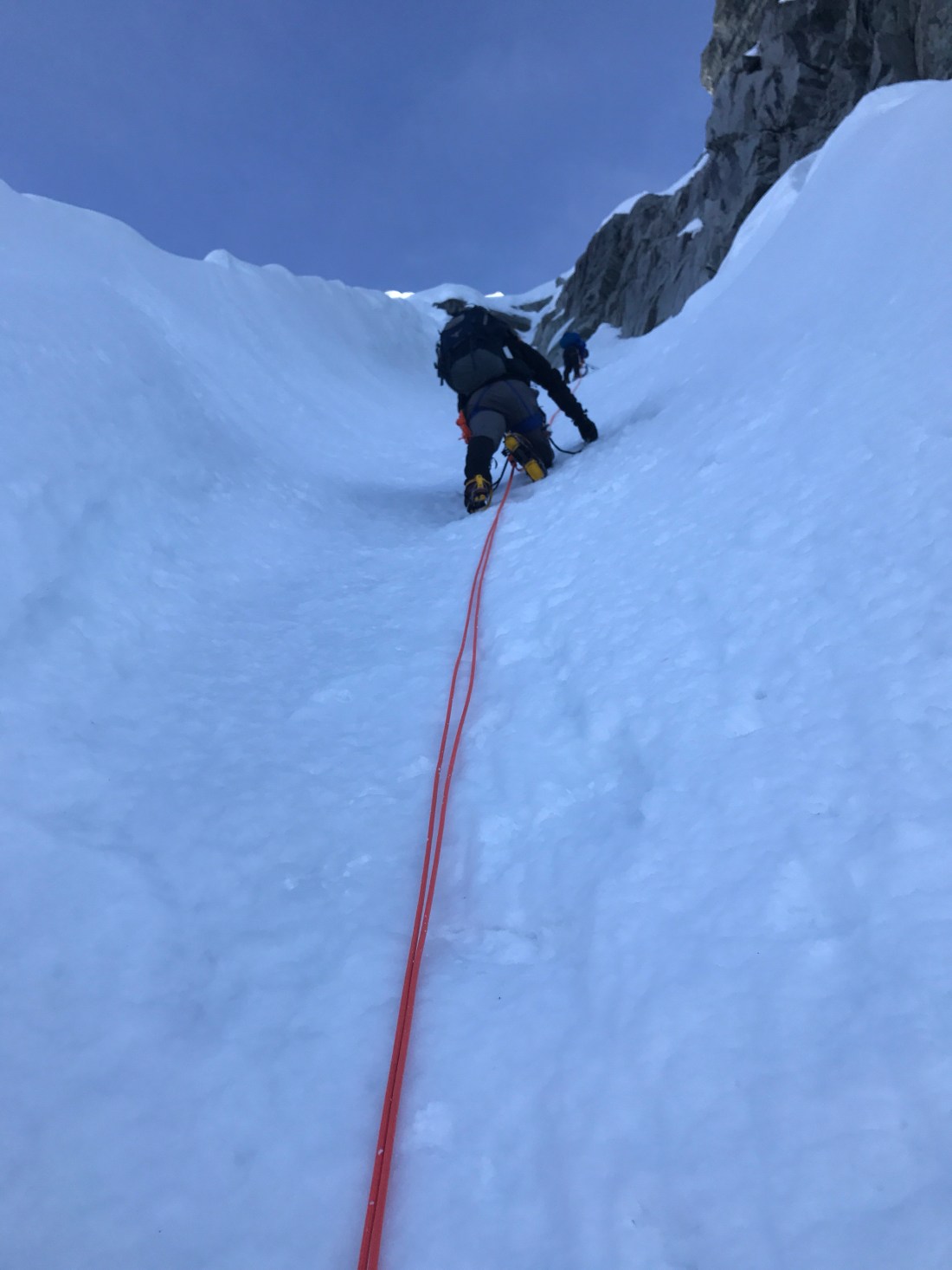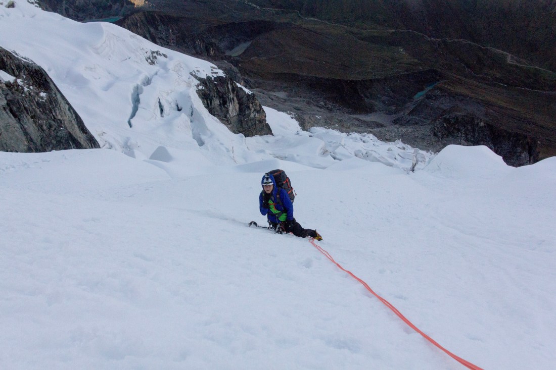 And so we started, at around 2am. The first hour or so was getting up to the glacier through the scree. A hour and a half later, we were climbing. As soon as we got on the glacier we were passing huge crevasse drops. Mellow at first, but quickly turned to 45 + plus alpine ice climbing. I’ll be honest I was so focused on the challenging climb I don’t remember how the exact route went, other that it was tough. When Nate submits our first ascent to the American Alpine Journal, he will write a more accurate description of the route. Here are some photos of us climbing up, most before 7am.